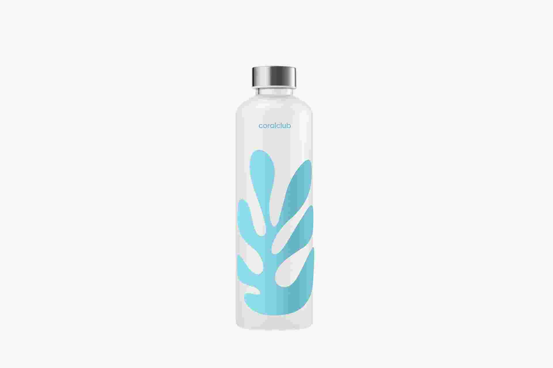 Láhev na vodu z borosilikátového skla vytvořená speciálně k 25. výročí Coral Clubu.