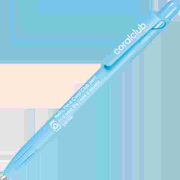 Kuličkové pero s tlačítkovým mechanismem vyrobené z PET RECYKLOVANÉHO materiálu s nápisem "Ahoj, jsem pero Coral Club! V minulém životě jsem byl plastový kelímek".